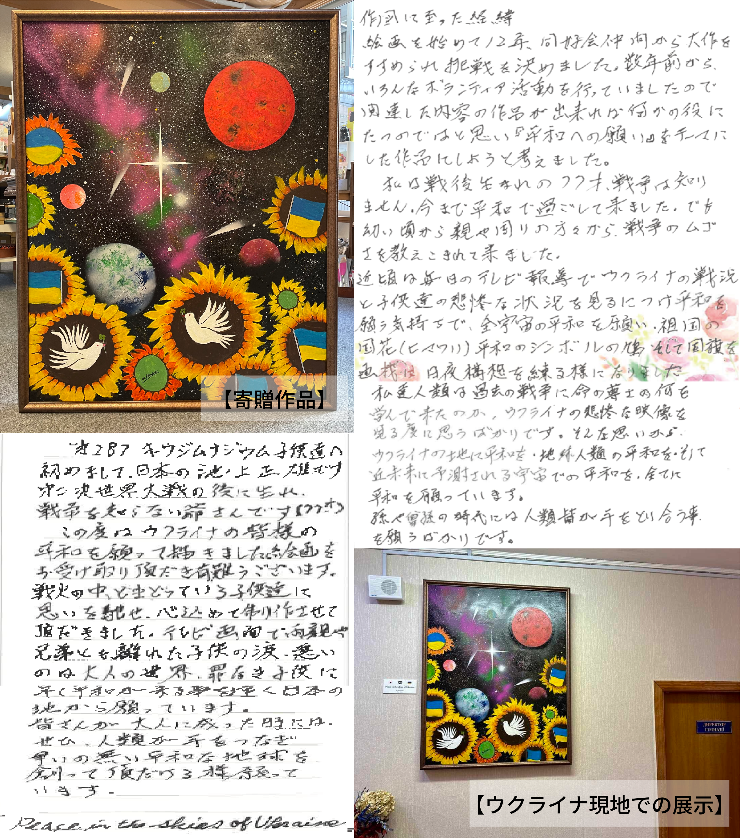 「先日、日本の友人が自作の絵「ウクライナの空に平和を」を贈ってくれました。ウクライナ人の将来を心から心配し、支援を受けることはとても大切なことです。池ノ上正雄氏の作品は長い道のりを経て、体育館の壁を飾り、私たちがこの世界で重要な存在であることを常に思い出させてくれています!」