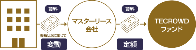 TECROWDでは、賃料収入を配当の原資とするファンドにおいて、原則として「マスターリース方式(一括借り上げ)」を採用しています。 マスターリース方式とは、マスターリース会社が物件を一括で借り上げ、入居者(転借人)へ転貸を行う仕組みです。 この仕組みにより、空室が発生した場合でもマスターリース会社から一定額の賃料がファンドに支払われるため、安定した賃料収入を確保できます。